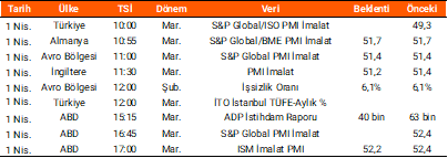 TÜİK tarafından açıklanan verilere göre, 2026 yılı şubat ayında dış ticaret açığı bir önceki yılın aynı ayına göre %15,9 artışla 9,03 mlr $ seviyesinde açıklandı. Ayrıca TÜİK verilerine göre yurt içinde mevsimsel etkilerden arındırılmış işsizlik oranı şubat ayında %8,5’e (önceki: %8,1) yükseldi. Dün TCMB Başkanı Fatih Karahan’ın açıklamaları yakından takip edildi. Orta Doğu’da yaşanan savaşın etkilerini en aza indirmek adına döviz likiditesinin desteklenmesi için altın kaynaklı işlemlerin kullanılmasının doğal bir tercih olduğunu belirtirken, artan enerji fiyatlarına karşı uygulamaya alınan eşel mobil sisteminin enflasyonist etkiyi düşürdüğünü ifade etti. TCMB, bankalara Türk lirası likidite yönetiminde esneklik sağlamak amacıyla döviz karşılığı Türk lirası swap işlemlerine başladı. Banka 1 hafta vadeli 5 mlr $ tutarında döviz karşılığı TL swap ihalesi açtı. Böylelikle bir süredir piyasada beklenen swap ihalesi Mart 2025’ten bu yana ilk kez açılmış oldu. Öte yandan Avro Bölgesi’nde mart ayına ilişkin öncü enflasyon verisi beklentilerin hafif altında %2,5 (önceki: %1,9) artış gösterdi. İngiltere ekonomisi yılın son çeyreğinde beklentilere paralel %0,1 büyüme kaydetti. Bugün yurt içinde S&P Global ve ISO tarafından açıklanan PMI imalat verisi ve İstanbul enflasyonu verisi izlenecek. Ayrıca Almanya, Avro Bölgesi, İngiltere ve ABD’de PMI imalat verileri yakından takip edilecek. ABD’de ADP özel sektör istihdam raporu (beklenti: 40 bin) yayımlanacak. Bugün ABD Başkanı Trump'ın "İran hakkında önemli bir güncelleme" sunmak üzere ulusa sesleniş konuşması bekleniyor. Konuşma yerel saat ile 21.00'de, Türkiye saati ile 2 Nisan'da 04.00'da gerçekleşecek.