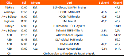 Dün yurt içinde TÜİK tarafından yayımlanan verilere göre ağustos ayında işsizlik oranı %8’den %8,5’e yükseldi. Ayrıca, dış ticaret açığı 2025 yılı ağustos ayında bir önceki yılın aynı ayına göre %15,8 azalışla 4,2 mlr $ seviyesinde gerçekleşti. Yurt dışında Almanya’da TÜFE eylül ayında beklentilerin hafif üzerinde %2,4 seviyesinde gerçekleşti.Avro Bölgesi’nde ise Avrupa Merkez Bankası (ECB) Başkanı Christine Lagarde yaptığı konuşmada, Avro Bölgesi ekonomisinin ABD'nin gümrük vergileri kaynaklı ticaret şoklarını beklenenden daha iyi atlattığını ve enflasyonun kontrol altında kaldığını belirtti. ABD’de CB tüketici güven endeksi eylülde beklentinin altında 94,2 olarak açıklandı. Bugün yurt içinde imalat PMI verisi açıklanacak. Yurt dışında ise Almanya, Avro Bölgesi ve ABD'den gelecek nihai imalat PMI verileri piyasaların odağında olacak. Ayrıca ABD'de özel sektör istihdam raporu ile inşaat harcamaları verileri takip edilecek.