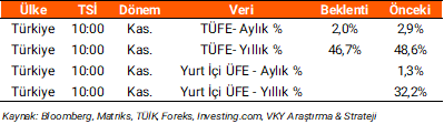 Dün yurt içinde ekim ayında 45,8 olan manşet PMI, kasımda 48,3’e yükselirken, 50,0 olan eşik değerin altında kalmaya devam etti. Manşet endeksinin son çeyrek ortasında kaydettiği artış, talepteki sınırlı toparlanma işaretlerinden kaynaklandı. Yurt dışı tarafında da imalat PMI verileri takip edildi. Buna göre Almanya ve Avro Bölgesi’nde sırasıyla 43,0 ve 45,2 olarak açıklandı. ABD’de ise ISM imalat PMI 48,4 ile piyasa beklentilerinin üzerinde gerçekleşirken, inşaat harcamaları ekimde %0,4 ile beklentilerin üzerinde arttı. Bugün yurt içinde enflasyon verileri takip edilecek, kasım ayında TÜFE için yıllık ve aylık piyasa beklentileri sırasıyla %46,7 ve %2,0 düzeylerinde oluştu. yurt dışında veri akışı sakin.
