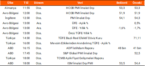Dün yurt içinde TÜİK tarafından açıklanan verilere göre, 2026 Ocak’ta Tüketici Fiyat Endeksi (TÜFE) piyasa beklentilerinin (%4,1) üzerinde, aylık bazda %4,84 yükselirken, bir önceki yılın aynı ayına göre %30,65 oldu. Bugün yurt içinde reel efektif döviz kuru, mevsim etkilerinden arındırışmış TÜFE ve TCMB Aylık Fiyat Gelişmeleri Raporu takip edilecek. Piyasa kapanışı ardından Garanti Bankası finansal sonuçlarını açıklayacak. Yurt dışında ise Almanya’da imalat dışı PMI verisi, Avro Bölgesi’nde imalat dışı PMI ile ÜFE ve öncü TÜFE verileri açıklanacak. ABD tarafında ise ADP özel sektör istihdam raporu ve ISM imalat dışı PMI verileri öne çıkıyor.