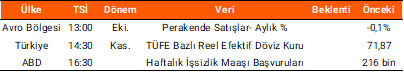Dün yurt içinin veri gündeminde, TÜİK tarafından açıklanan kasım ayı enflasyon verileri yakından takip edildi. 2025 Kasım’da TÜFE aylık bazda %1,25 olan piyasa beklentilerinin altında %0,87 yükselirken, bir önceki yılın aynı ayına göre %31,07 seviyesinde gerçekleşti. Ana harcama grupları incelendiğinde, aylık en yüksek artış eğlence ve kültür grubunda kaydedilirken, tek düşüş görülen grup gıda ve alkolsüz içecekler grubu oldu. Yurt içi üretici fiyat endeksi ise kasım ayında bir önceki aya göre %0,84, yıllık %27,23 artış gösterdi. Yurt dışı piyasalarda, Avro Bölgesi’nde açıklanan ekim ayı ÜFE verisi aylık %0,1, yıllık %-0,5 seviyesinde açıklandı. ABD’de ise ADP özel sektör istihdamı kasım ayında artış beklentilerinin aksine 32 bin azalış gösterdi. Ayrıca ABD’de sanayi üretimi eylülde beklentilere paralel %0,1 olurken, kapasite kullanım oranı aynı dönemde %75,9 ile beklentilerin altında gerçekleşti. ABD ISM hizmet PMI ise kasım ayında 52,6 ile beklentileri aştı. Bugün küresel piyasalarda, Avro Bölgesi’nde perakende satışlar verisi izlenirken, ABD’de haftalık işsizlik maaşı başvuruları açıklanacak. Yurt içinde ise bugün TÜFE bazlı reel efektif döviz kuru açıklanacak.