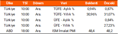 Cuma günü İstanbul Sanayi Odası (İSO) tarafından yayımlanan anket sonuçlarına göre, kasım ayında 48,0 seviyesinde olan manşet PMI, aralıkta 48,9’a yükseldi. Bu artış, faaliyet koşullarındaki bozulmanın oldukça sınırlı kaldığını ve son 12 ayın en hafif düzeyinde gerçekleştiğini gösterdi. Yurt dışında aralık ayına ilişkin imalat PMI verileri takip edildi; buna göre Avro Bölgesi’nde 48,8 ve Almanya’da 47,0 seviyesinde gerçekleşerek beklentilerin altında kaldı. ABD’de ise imalat PMI 51,8 ile piyasa beklentilerine paralel açıklandı. Bugün yurt içinde enflasyon verileri yakından izlenecek. Yurt dışında ise ABD’de ISM imalat PMI verisi açıklanacak. Haftanın ilerleyen günlerinde yurt içinde mevsim etkilerinden arındırılmış TÜFE, hazine nakit dengesi ve sanayi üretimi verileri takip edilecek. Yurt dışında ise ABD’de ADP istihdam raporu, dayanıklı mal siparişleri, dış ticaret dengesi ve tarım dışı istihdam öne çıkan başlıca veriler olacak. Avro Bölgesi’nde ise HCOB imalat dışı PMI, tahmini TÜFE, tüketici güven endeksi ve ÜFE açıklanması beklenen önemli veriler arasında yer alıyor.