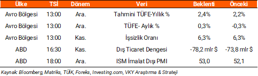 Dün yurt içinde veri akışı sakindi. Yurt dışında Almanya’da aylık enflasyon %0,7 ve yıllık enflasyon ise %2,9 artarak beklentilerin üzerinde gerçekleşti. ABD’de fabrika siparişleri 2024 Kasım’da %0,4 ile beklentilerin üzerinde düşüş kaydederken, hizmet sektörü PMI 2024 Aralık’ta 0,7 puan artışla 56,8 değerine ulaştı. Bugün Avro Bölgesi’nde TÜFE açıklanırken, ABD’de dış ticaret dengesi ve ISM imalat dışı PMI takip edilecek.