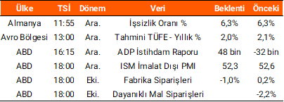 Dün TÜİK tarafından açıklanan mevsim etkilerinden arındırılmış TÜFE verisi aralık ayında aylık %1,67 yükselirken, mevsimsellikten arındırılmış çekirdek TÜFE’de %2,06 yükseliş görüldü. Yurt dışı piyasalarda, Avro Bölgesi ve Almanya’da açıklanan aralık ayı bileşik PMI verileri sırasıyla 51,5 ve 51,3 seviyelerinde beklentilerin altında açıklandı. Ayrıca, Almanya’da aralık ayında TÜFE aylık %0,2, yıllık ise %2 artış gösterdi. Bugün küresel piyasalarda, ABD’de ADP istihdam raporu, ISM imalat dışı PMI ve dayanıklı mal siparişleri verileri takip edilecek. Ayrıca, Almanya’da işsizlik oranı, Avro Bölgesi’nde ise öncü TÜFE verileri izlenecek. Yurt içinde ise bugün açıklanması planlanan bir veri akışı bulunmamakta.