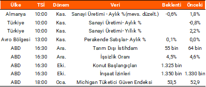 Dün Hazine ve Maliye Bakanlığı tarafından açıklanan verilere göre merkezi yönetim bütçesi aralık ayında 333,1 mlr TL açık verirken, bu dönemde faiz dışı bütçe dengesi 216,9 mlr TL açık olarak kaydedildi. Avro Bölgesi’nde tüketici güven endeksi aralık ayında -14,6 seviyesinde açıklanırken, işsizlik oranı 2025 Kasım’da aylık %6,3 ile beklentilerin altında gerçekleşti. Avro Bölgesi ÜFE verisi ise kasım ayında bir önceki aya göre %0,5 artarken, yıllık bazda %1,7 gerileme kaydetti. ABD’de ekim ayı dış ticaret dengesi 29,4 mlr dolar açık olarak gerçekleşirken, haftalık işsizlik maaşı başvuruları ise 208 bin seviyesinde beklentilerin altında açıklandı. Bugün küresel piyasaların odağında ABD’de açıklanacak aralık ayı istihdam verileri olacak. Ayrıca, ABD’de konut başlangıçları, inşaat izinleri ve Michigan tüketici güven endeksi verileri de açıklanacak. Öte yandan, ABD Yüksek Mahkemesi’nin Trump’ın tarifelerine ilişkin kararını bugün açıklaması bekleniyor. Avro Bölgesi’nde perakende satışlar, Almanya’da ise sanayi üretimi verileri izlenecek. Yurt içinde ise bugün kasım ayı sanayi üretimi verisini takip edeceğiz.