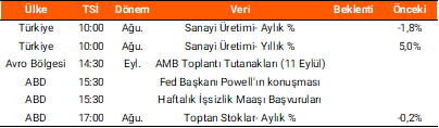 Dün yurt içinde önemli bir veri akışı bulunmazken, yurt dışında ABD’de FOMC toplantı tutanakları yayımlandı. Fed’in Eylül toplantısı tutanakları, birçok yetkilinin zayıflayan işgücü piyasasına dikkat çekerek faiz indiriminin uygun olabileceğini düşündüğünü, ancak enflasyona ilişkin belirsizliklerin bazı üyeleri ihtiyatlı bir yaklaşım benimsemeye ittiğini gösterdi. Ayrıca katılımcıların çoğunluğunun, enflasyon verilerinin %2 hedefinden sapması ve tarifelerin etkilerine dair belirsizliklerin, enflasyon görünümünde yukarı yönlü riskler oluşturduğuna dikkat çektiği görüldü. Tutanakların ardından ekim toplantısına yönelik 25 bp faiz indirim beklentisi %92,5 seviyesinde fiyatlanmaya devam ediyor. Fed'in gelecek toplantısının 28-29 Ekim'de gerçekleştirileceğini hatırlatalım. Bugün yurt içinde sanayi üretimi verisi takip edilecek. Küresel tarafta Avro Bölgesi'nde Avrupa Merkez Bankası'nın (AMB) toplantı tutanakları yayımlanacak.