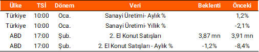 Dün yurt içinde veri gündemi sakindi, yurt dışında ise Almanya’da sanayi üretimi ocakta %1,0’lik artış beklentilerinin aksine %0,5 gerileyerek sanayi sektöründeki daralmanın sürdüğüne işaret etti. Bugün yurt içinde ocak ayına ilişkin sanayi üretimi verileri takip edilecek. Küresel tarafta ise ABD’de şubat ayına ait ikinci el konut satışları açıklanacak.