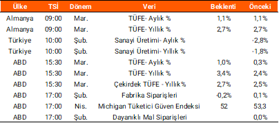 Dün yurt içinde takip edilen bir makroekonomik veri akışı olmazken, küresel piyasalarda ABD verilerinin yoğun olduğu bir takvim izlendi. Enflasyon göstergesi olarak yakından takip edilen PCE fiyat endeksi şubat ayında, aylık %0,4, yıllık %2,8 artarak beklentilerle uyumlu gerçekleşti. Çekirdek PCE endeksi ise, 2026 Şubat’ta aylık %0,4, yıllık %3,0 yükseliş gösterdi. Bununla birlikte ABD ekonomisinin 4Ç25 döneminde bir önceki yılın aynı dönemine göre %0,5 ile beklentilerin altında büyüdüğü açıklandı. Haftalık işsizlik maaşı başvuruları 219 bin seviyesinde beklentilerin üzerinde gerçekleşti. Bugünün veri ajandasında, ABD’de açıklanacak mart ayı enflasyon verileri öne çıkıyor. Ayrıca bugün ABD’de fabrika siparişleri, dayanıklı mal siparişleri ve Michigan tüketici güven endeksi verileri izlenecek. İçeride ise şubat ayı sanayi üretimi verisini takip edeceğiz. Ayrıca yarın Pakistan’da ABD ile İran arasında bir görüşme yapılması planlanmaktadır.