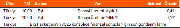 Cuma günü yurt içinde TCMB Başkanı Fatih Karahan tarafından açıklanan yılın son enflasyon raporu takip edildi. Raporda 2025 yıl sonunda %31 ile %33 aralığında (önceki: %23-29); 2026 yıl sonunda ise %13 ile %19 aralığında gerçekleşeceği tahmin edildiği açıklandı. Hazine ve Maliye Bakanlığı tarafından açıklanan verilere göre ise ekim ayında hazine nakit dengesi 195,9 mlr TL açık verirken, faiz dışı denge 36 mlr TL açık olarak gerçekleşti. Bugün yurt içinde sanayi üretimi verileri açıklanırken, küresel piyasalarda açıklanması beklenen bir makroekonomik veri akışı bulunmamakta. Ayrıca bugünün BST 100 şirketlerinin 3Ç25 konsolide finansal sonuçları için son gönderim günü olduğunu hatırlatalım.