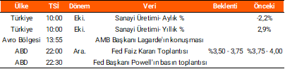 Dün yurt içi ve yurt dışı veri akışı sakin seyretti. ABD Başkanı Trump Nvidia’nın H200 yapay zeka çiplerini Çin’e ihraç etmesine %25 ek vergi karşılığında izin verdiğini açıkladı. Bugün yurt içinde ekim ayına ilişkin sanayi üretimi verileri açıklanacak. Ayrıca bugün piyasa kapanışı ardından Mavi Giyim üçüncü çeyrek finansal sonuçlarını açıklayacak. Yurt dışında Avro Bölgesi’nde AMB Başkanı Lagarde’ın konuşması izlenecek. ABD’de ise Fed’in yılın son faiz kararı takip edilecek; Piyasaların yaklaşık %87 ihtimalle 25 baz puanlık indirimini fiyatladığını hatırlatalım. Toplantı sonrası Fed Başkanı Powell’ın yapacağı açıklamalar yakından izlenecek.