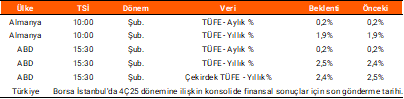 Dün yurt içinde TÜİK tarafından açıklanan ocak ayı sanayi üretim endeksi, yıllık bazda %1,8 aylık bazda ise %2,8 azalış gösterdi. Sanayinin alt sektörleri arasında, maden ve taş ocakçılığı sektörü yıllık %2,8 azalarak en fazla daralan sektör endeksi oldu. Diğer taraftan ABD’de takip edilen ikinci el konut satışları 3,87 mn olan beklentilerin üzerinde 4,09 mn olarak açıklandı. Bugün yurt içinde veri gündemi oldukça sakin. Almanya ve ABD’de şubat ayı enflasyon verileri yakından takip edilecek. Piyasa beklentileri ABD’nin aylık enflasyonunun %0,2 yıllık enflasyonunun ise %2,5 seviyesinde oluşacağı yönünde şekilleniyor. Son olarak bugün Borsa İstanbul’da 4Ç25 dönemine ilişkin konsolide finansal sonuçların açıklanması sona eriyor.