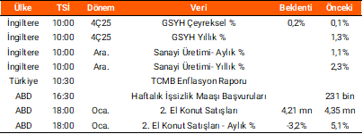 Dün yurt içinde veri gündemi sakindi. Küresel piyasalarda ise ABD tarım dışı istihdam verisi ocak ayında, 66 bin kişi olan beklentilerin oldukça üzerinde 130 bin kişi arttı. Aynı dönemde işsizlik oranı piyasa beklentisinin altında açıklanarak %4,4 seviyesinden %4,3 seviyesine geriledi. Fed’in dikkatle takip ettiği ortalama saatlik kazançlar verisi aylık %0,4 ve yıllık ise %3,7 ile beklentilerin üzerinde artış gösterdi. Veri sonrası Fed’in faiz indirimine ilişkin beklentiler de Temmuz ayına ötelendi. Bugün yurt içinde TCMB’nin yayımlayacağı Enflasyon Raporu ve TCMB Başkanı Fatih Karahan’ın yapacağı açıklamalar piyasaların odağında olacak. 7 Kasım’da açıklanan son enflasyon raporunda; TCMB'nin 2026 yıl sonu ara hedefi %16 ve tahmin aralığı ise bir önceki raporda olduğu gibi %13-19 olarak belirlenmişti. Yurt dışında ise İngiltere’de 2025 yılı dördüncü çeyrek GSYH büyüme verileri ile aralık ayı sanayi üretimi rakamları takip edilecek. ABD tarafında ise haftalık işsizlik maaşı başvuruları ve ikinci el konut satış verileri izlenecek.