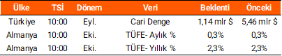 Dün yurt içinde önemli veri akışı bulunmuyordu. İngiltere’de Temmuz-Eylül dönemine ilişkin işgücü verileri yayımlandı. Buna göre işsizlik oranı %5’e yükselerek 2021’den bu yana en yüksek seviyeye ulaştı. Almanya’da ZEW ekonomik güven endeksi kasım ayında aylık bazda 0,8 puan azalışla 38,5 puana gerilerken beklentileri karşılayamadı. Bugün yurt içinde cari denge verisi izlenecek. Almanya’da ise ekim ayına ilişkin enflasyon verileri yakından takip edilecek.
