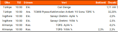 Dün yurt içinin veri gündeminde TCMB PPK faiz kararı toplantısı yakından takip edildi. TCMB, politika faizi olan bir hafta vadeli repo faiz oranını, piyasa beklentisine paralel, 150 bp indirerek %38 seviyesine düşürdü. Ayrıca Kurul, Merkez Bankası gecelik vadede borç verme faiz oranını %42,5’ten %41’e ve gecelik vadede borçlanma faiz oranını ise %38’den %36,5’e indirdiğini açıkladı. Yurt dışı piyasalarda ise, ABD’de açıklanan dış ticaret dengesi verisi eylül ayında 52,8 mlr TL açık olarak gerçekleşti. Haftalık işsizlik maaşı başvuruları ise 236 bin ile beklentilerin üzerinde açıklandı. Bugün küresel piyasalarda, İngiltere’de sanayi üretimi izlenirken, Almanya’da kasım ayı TÜFE verisi açıklanacak. Yurt içinde ise TCMB piyasa katılımcıları anketi ve cari denge verileri takip edilecek.