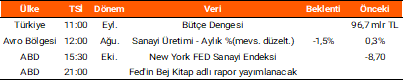 Dün yurt içinde veri akışı sakindi. IMF, 2025 Güz Global Ekonomik Görünüm Raporu’nda Türkiye ekonomisine yönelik büyüme tahminlerini 2025 yılı için %3,0’ten %3,5’e ve 2026 yılı için ise %3,3’ten %3,7 seviyesine revize ettiğini açıkladı. Yurt dışında Almanya’da Zew Beklenti Endeksi ekim ayında beklentilerin altında 39,3 seviyesinde gerçekleşti. ABD’de Fed Başkanı Jerome Powell, yaptığı konuşmada, ABD hükümetinin kapanmasından önce yayımlanan verilerin ekonomik büyümenin yukarı yönlü bir eğilim sergilediğini ortaya koyduğunu belirtti. Para politikası seyrinin ekonomik verilere ve risk değerlendirmelerine bağlı kalacağını vurguladı. Powell, istihdam piyasasında aşağı yönlü risklerin arttığına dikkat çekerken, enflasyonun halen yukarı yönlü baskılar içerdiğini söyledi. Ayrıca, küresel ticaretteki tarifelerle bağlantılı olarak dirençli bir enflasyon riskinin sürdüğüne işaret etti. Fed Başkanı, bilanço küçültme programının ise yakında sona erebileceğinin sinyalini verdi. Bugün yurt içinde eylül ayına ilişkin merkezi yönetim bütçe dengesi verisi açıklanacak. Yurt dışında ise Avro Bölgesi'nde sanayi üretimi, ABD tarafında ise New York Fed imalat endeksi ile Fed’in Bej Kitap raporu piyasaların odağında olacak.