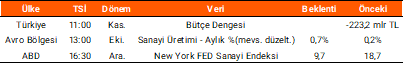 Cuma günü yurt içinde TCMB tarafından açıklanan verilere göre, ekim ayında cari işlemler hesabı, piyasa beklentilerinin üzerinde 457 mn $ fazla kaydetti. Bir önceki ay 20,3 mlr $ olan 12 aylık kümülatif cari işlemler açığı, ekim ayında 22,0 mlr $’a ulaşmış oldu. Ayrıca, TCMB Piyasa Katılımcıları Anketi sonuçlarına göre, 2025 yılı Aralık ayı itibariyle yıl sonu TÜFE beklentisi %31,17’e gerilerken, 2025 sonu büyüme beklentisi %3,50 seviyesine yükseldi. Yurt dışında ise Almanya’da yıllık enflasyon kasım ayında değişmeyerek %2,3 seviyesinde sabit kalırken, aylık enflasyon %0,2 geriledi. Bugün yurt içinde kasım ayı bütçe dengesi takip edilecek. Yurt dışında Avro Bölgesi’nde sanayi üretimi, ABD’de ise New York Fed sanayi endeksi açıklanacak. Haftanın devamında yurt içinde konut satışları, PPK toplantı tutanakları ve tüketici güven endeksi gündemde olacak. Yurt dışında ise ABD’de tarım dışı istihdam, imalat ve imalat dışı PMI verileri ile enflasyon öne çıkıyor. Avro Bölgesi’nde sanayi üretimi, HCOB imalat ve imalat dışı PMI, enflasyon verileri ve AMB faiz kararı yakından izlenecek. Diğer yandan, İngiltere ve Japonya merkez bankası faiz kararı toplantıları da takip edilecek.