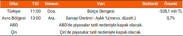 Cuma günü TCMB tarafından açıklanan cari işlemler dengesi verisi aralık ayında beklentilerin üzerinde 7,3 mlr $ açık verdi. Piyasa katılımcıları anketi sonuçlarına göre ise, 2026 yılı şubat ayı itibariyle yıl sonu TÜFE beklentisinin %24,11 seviyesine yükseldiği açıklandı. Yurt dışı piyasalar tarafında ise ABD’de gecikmeli aralık ayı enflasyon verileri yakından takip edildi. ABD’de TÜFE ocak ayında aylık %0,2, yıllık ise %2,4 olarak beklentilerin hafif altında kaydedildi. Çekirdek TÜFE ise bu dönemde %0,3, yıllık %%2,5 seviyesinde beklentilerle uyumlu gerçekleşti. Verilerin ardından ABD tahvil faizlerinde düşüş izlendi, Fed'in üç faiz indirim olasılığı ise %50 olarak fiyatlandı. Avro Bölgesi ekonomisinin 4Ç25 döneminde çeyreklik %0,3, yıllık ise %1,3 beklentilere paralel büyüme gösterdiği açıklandı. Küresel piyasalar veri akışı açısından haftaya sakin başlayacak. ABD’de piyasalar tatil nedeniyle kapalı olurken, Avro Bölgesi’nde sanayi üretimi verisi izlenecek. Yurt içinde ise bugün ocak ayı bütçe dengesi verisi açıklanırken, piyasa kapanışının ardından Şişecam’ın 4Ç25 dönemine ilişkin finansal tablolarını yayınlaması bekleniyor.