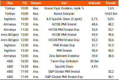 Dün Hazine ve Maliye Bakanlığı’nın açıkladığı verilere göre, kasım ayında merkezi yönetim bütçesi 169,5 mlr TL fazla verdi. Aynı dönemde faiz dışı bütçe dengesi ise 287,4 mlr TL fazla olarak gerçekleşti. Avro Bölgesi’nde sanayi üretimi aylık %0,8 yıllık ise %2 artış gösterdi. Bugün yurt içinde konut satış rakamları açıklanacak. Almanya, Avro Bölgesi, İngiltere ve ABD’de imalat ve hizmet PMI verileri takip edilecek. Ayrıca ABD’de daha önce ertelenen tarım dışı istihdam verileri yakından izlenecek. Kasım’da istihdamın 50 bin kişi artması, işsizlik oranının ise %4,4’e ulaşması bekleniyor.