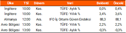 Dün yurt içinde açıklanan konut satışları verisi kasım ayında yıllık %7,8 azalışla 141.100 adet olarak gerçekleşti. Konut fiyat endeksinde ise 2025 Kasım’da aylık %2,7 artış kaydedildi. Yurt dışı piyasalar tarafında ise dün oldukça yoğun bir makroekonomik veri akışı takip edildi. İngiltere’de işsizlik oranı ağustos-ekim döneminde %5,1 ile beklentilere paralel açıklanırken, aralık ayında bileşik PMI 52,1 ile beklentileri aştı. Avro Bölgesi bileşik PMI ise 2025 Aralık’ta 51,9 seviyesine geriledi. ABD tarım dışı istihdam verisi kasım ayında 50 bin olan beklentilerin üzerinde 64 bin artış gösterirken, ortalama saatlik kazançlar 2025 Kasım’da bir önceki aya göre %3,5 arttı. ABD’de işsizlik oranı ise bu dönemde beklentilerin üzerinde %4,6 seviyesinde açıklandı. Verilerin ardından, ABD 10 yıllık tahvil faizi %4,17 seviyesine gerilerken, ons altın %0,31’lik artışla 4.318 $ seviyelerine yükseliş gösterdi. Bugün yurt dışı piyasalarda, İngiltere ve Avro Bölgesi’nde kasım ayı TÜFE verileri izlenirken, yurt içinde açıklanması planlanan bir veri akışı bulunmamakta.