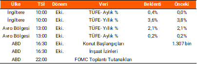Dün yurt içinde TCMB tarafından açıklanan verilere göre ekim ayında konut fiyat endeksi, aylık bazda %1,6 ve yıllık bazda ise %31,6 arttı. ABD’de ağustos ayında fabrika siparişlerinin aylık %1,4 arttığı açıklandı. Bugün yurt içinde veri gündemi sakin, yurt dışında, İngiltere ve Avro Bölgesi’nde TÜFE, ABD’de ise konut başlangıçları, inşaat izinleri ve FOMC toplantı tutanaklarının yayımlanması bekleniyor. Diğer yandan, yapay zeka temalı şirket değerlemelerine yönelik endişelerin arttığı bu dönemde NVIDIA’nın kapanışın adından açıklayacağı sonuçlar yakından izlenecek.