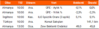Dün yurt içinde veri akışı oldukça sakindi. ABD’de ise piyasalar tatil nedeniyle kapalıydı. Avro Bölgesi’nde aralık ayına ilişkin enflasyon verileri yakından takip edildi. Yıllık bazda %1,9 (önceki: %2,1) olarak açıklanan enflasyon %2,0 olan beklentilerin altında gerçekleşirken, aylık bazda %0,2 seviyesinde kaydedildi. Uluslararası Para Fonu (IMF), Dünya Ekonomik Görünüm Raporu’nun ocak sayısını yayımladı. Raporda, Türkiye ekonomisinin bu yıl %4,2 ve gelecek yıl %4,1 büyüyeceğini bekledikleri belirtildi. Bugün yurt içinde TÜİK tarafından açıklanacak olan konut satışları verisi izlenecek. Almanya’da enflasyon ve Zew beklenti endeksi verileri, İngiltere’de ise ILO işsizlik oranı gündem maddeleri arasında öne çıkıyor.