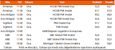 TCMB, dün gerçekleştirdiği PPK toplantısında politika faizini piyasa beklentilerinin (150 bp) altında 100 bp indirerek %37 seviyesine indirdi. Ayrıca Kurul, gecelik vadede borç verme faiz oranını %41’den %40’a ve gecelik vadede borçlanma faiz oranını ise %36,5’ten %35,5’e çektiğini açıkladı. Kararla birlikte yapılan açıklamada, aralık ayında enflasyonun ana eğiliminde gerileme kaydedildiği belirtildi. Diğer taraftan TCMB’nin dün açıkladığı verilere göre, tüketici güven endeksi ocak ayında 83,7 seviyesine (önceki: 83,4) yükselirken, reel kesim güven endeksi 0,7 puan azalışla 103,0 seviyesinde gerçekleşti. Ocak ayında kapasite kullanım oranı 0,3 puan azalarak %74,1 puana geriledi. Yurt dışında ise ABD ekonomisinin 2025’in üçüncü çeyreğinde %4,3 olan beklentilerin üzerinde %4,4 büyüme kaydettiği açıklandı. ABD’de beklentilerin hafif üstünde açıklanan PCE fiyat endeksi yıllık bazda %2,8 (beklenti: %2,7), çekirdek PCE endeksi ise %2,8 olarak beklentilerle uyumlu gerçekleşti. Bugün veri takviminde ABD ve Avro Bölgesi başta olmak üzere çeşitli ülkelerde ocak ayı öncü hizmet ve imalat PMI verileri yakından takip edilecek. Ayrıca bugün piyasa kapanışı ardından Fitch ve Moody’s’in Türkiye için kredi notu değerlendirme raporlarının yayımlanması bekleniyor. İki kurumdan not artışı beklenmemekle birlikte, görünümde yukarı yönlü revizyon daha olası görünmektedir.