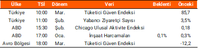 Perşembe günü, yurt içinde veri akışı sakindi, yurt dışında İngiltere ve Avro Bölgesi merkez bankalarının faiz kararı toplantıları öne çıktı. İngiltere Merkez Bankası (BoE), mart ayında politika faizini beklentilere paralel olarak %3,75 seviyesinde sabit tuttuğunu açıkladı. Avro Bölgesi’nde Avrupa Merkez Bankası (AMB), üç ana politika faizini piyasa beklentilerine paralel sabit bıraktı. Banka, artan enerji fiyatlarının enflasyon üzerinde oluşturduğu yukarı yönlü baskıyı dikkate alarak enflasyon tahminlerini yükseltirken, büyüme beklentilerini ise aşağı yönlü güncelledi. Avrupa Merkez Bankası (AMB), 2026 yılı enflasyon hedefini %1,9'dan %2,6'ya, 2027 yılı tahminini ise %1,8'den %2'ye, 2028 yılı tahminini ise %2'den %2,1'e çıkardı. ABD’de ise haftalık işsizlik maaşı başvuruları beklentilerin altında 205 bin seviyesinde açıklandı. Ayrıca ocak ayında yeni konut satışları %17,6 azalışla 587 bin adede geriledi. Cuma günü ise Almanya’da şubat ayında ÜFE aylık %0,5 ve yıllık ise %3,3 ile beklentilerin üzerinde geriledi. Bugün yurt içinde Tüketici Güven Endeksi açıklanacak. Yurt dışında ise ABD’de inşaat harcamaları verisi ve Avro Bölgesi’nde Tüketici Güven Endeksi izlenecek.