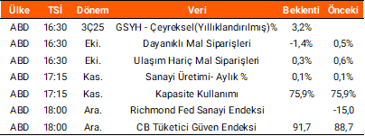 Dün yurt içi ve yurt dışı piyasalarda makroekonomik veri akışı oldukça sakindi. İngiltere ekonomisinin üçüncü çeyrekte beklentilerle uyumlu olarak bir önceki çeyreğe göre %0,1, yıllık bazda ise %1,3 büyüdüğü açıklandı. Bugün ise küresel piyasalarda ABD’de tatil öncesi yoğun veri akışı takip edilecek. ABD’de büyüme, dayanıklı mal siparişleri, sanayi üretimi, kapasite kullanımı ve CB tüketici güven endeksi verileri açıklanması planlanan veriler arasında yer almakta. Yurt içinde ise bugün açıklanması beklenen bir veri akışı bulunmamakta.