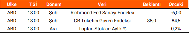 Dün yurt içi piyasalarda veri akışı oldukça sakindi. Yurt dışı piyasalar tarafında ise, ABD’de açıklanan dayanıklı mal siparişleri verisi aralık ayında beklentilerle uyumlu olarak %1,4 azalırken, fabrika siparişlerinde aynı dönemde %0,7 gerileme kaydedildi. ABD Yüksek Mahkemesi'nin gümrük tarifelerine yönelik yetkilerini iptal etmesinin ardından Beyaz Saray, alternatif hukuki yollara başvurdu ve %10’luk küresel gümrük vergisini bugün itibarıyla resmen uygulamaya başladı. Bugün küresel piyasalarda ABD’de açıklanacak Richmond Fed sanayi endeksi, CB tüketici güven endeksi ve toptan stoklar verileri izlenecek. Ayrıca bugün Trump'ın gerçekleştireceği birliğin durumu konuşması yakından takip edilecek. Yurt içinde bugün TCMB tarafından hanehalkı beklenti anketi ve sektörel enflasyon beklentileri açıklanacak, piyasa kapanışının ardından, Aselsan’ın 4Ç25 dönemine ilişkin finansal tablolarını yayınlaması bekleniyor.
