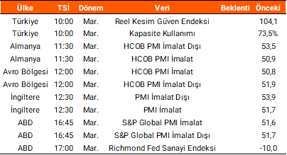 Dün yurt içinde açıklanan tüketici güven endeksi, 2026 yılı mart ayında bir önceki aya göre %0,8 azalarak 85,0 seviyesine geriledi. Aynı dönemde mart ayı hane maddi durumu endeksi %2,0 artışla 72,8 düzeyine yükseldi. ABD’de inşaat harcamaları %0,1 beklentilerin aksine %0,3 daralma olarak açıklandı. Avro Bölgesi’nde tüketici güven endeksi ise -16,3 seviyesinde gerçekleşti. Bugün yurt içinde reel kesim güven endeksi ve kapasite kullanım oranı verileri takip edilecek. Almanya, Avro Bölgesi, İngiltere ve ABD’de öncü PMI imalat ve hizmet PMI verileri izlenecek.