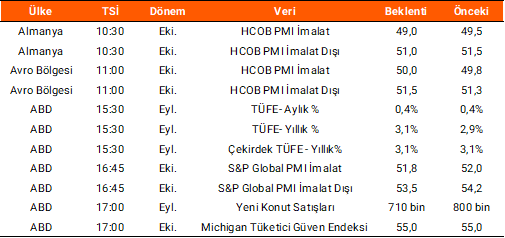Dün yurt içinde TÜİK ve TCMB iş birliğiyle yayımlanan verilere göre, mevsim etkilerinden arındırılmış tüketici güven endeksi ekim ayında bir önceki aya göre %0,3 azalarak 83,6 seviyesine geriledi. Türkiye Cumhuriyet Merkez Bankası (TCMB), bir hafta vadeli repo faiz oranını piyasa beklentisinin altında kalarak 100 baz puan indirip %39,5 seviyesine çektiğini açıkladı. Yurt dışında ise, Avro Bölgesi’nde ekim ayı tüketici güven endeksi -14,2 olarak açıklandı. Bugün yurt içinde önemli bir veri gündemi bulunmazken, yurt dışında Almanya, Avro Bölgesi ve ABD’de imalat ve hizmet PMI verileri takip edilecek. Ayrıca ABD’de eylül ayı TÜFE verileri açıklanacak. Piyasa beklentisi, TÜFE’nin aylık bazda %0,4, yıllık bazda ise %3,1 seviyesinde gerçekleşmesi yönünde oluştu.
