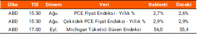 Dün yurt içinde veri akışı sakindi. Cumhurbaşkanı Recep Tayyip Erdoğan ile ABD Başkanı Donald Trump arasında Beyaz Saray'da gerçekleştirilen görüşme kapsamında, Türkiye ile Amerika Birleşik Devletleri arasında "Stratejik Sivil Nükleer İşbirliği Mutabakat Zaptı" imzalandığı açıklandı. Küresel piyasalarda dün ABD ekonomisine dair veriler öne çıktı. ABD ekonomisi, 2025 yılının ikinci çeyreğinde piyasa beklentisi olan %3,3’ün üzerinde, %3,8 oranında büyüyerek 2023’ün üçüncü çeyreğinden bu yana en güçlü büyüme performansını sergiledi. Ağustos ayında dayanıklı mal siparişleri, beklentilerin aksine %2,9 artış gösterirken, toptan stoklar %0,2 artış beklentisine karşın aynı oranda azaldı. Haftalık işsizlik maaşı başvuruları 233 binlik beklentinin altında kalarak 218 bin seviyesinde gerçekleşti. Bugün küresel piyasaların odağında, Fed’in enflasyon göstergesi olarak yakından izlediği çekirdek PCE fiyat endeksi yer alacak. Piyasa beklentisi, endeksin yıllık bazda %2,9 seviyesinde açıklanması yönünde şekillenmiş durumda.
