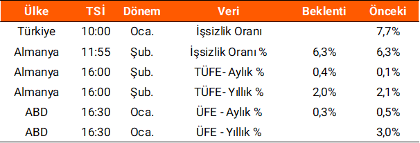 Dün TÜİK tarafından dış ticaret verilere göre, 2026 yılı ocak ayında dış ticaret açığı yıllık %11,6 artışla 8,4 mlr $ seviyesinde açıklandı. Yurt dışı piyasalarda ise, Avro Bölgesi’nde açıklanan tüketici güven endeksi -12,2 seviyesinde beklentilerle uyumlu gerçekleşti. ABD’de haftalık işsizlik maaşı başvuruları 212 bin ile beklentilerin altında açıklandı. Yurt dışı piyasaların veri ajandasında bugün, Almanya’da TÜFE, ABD’de ise ÜFE verileri buluyor. Yurt içinde ise ocak ayı işsizlik oranı verisi takip edilecek. Ayrıca bugün piyasa kapanışının ardından, Doğuş Otomotiv, Brisa, Tab Gıda ve Atakey Patates Gıda’nın 4Ç25 dönemine ilişkin finansal tablolarını yayınlaması bekleniyor.