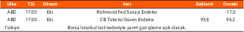Dün yurt içinde TCMB’nin yayınladığı verilere göre, ekim ayında mevsimsellikten arındırılmış reel kesim güven endeksi aylık 1,2 puan artışla 102,0 seviyesinde gerçekleşti. Ayrıca, imalat sanayi genelinde mevsimsel etkilerden arındırılmış kapasite kullanım oranı ise ekim ayında aylık bazda 0,2 puan artarak %74,0 seviyesinde gerçekleşti. TÜİK tarafından yayımlanan verilere göre işsizlik oranı eylül ayında bir önceki aya göre değişmeyerek %8,6 olarak gerçekleşti. Ayrıca, dün Cumhurbaşkanlığı Külliyesi’nde gerçekleşen görüşmede, Cumhurbaşkanı Recep Tayyip Erdoğan ile İngiltere Başbakanı Keir Starmer, iki ülke arasında Eurofighter Typhoon savaş uçakları konusunda iş birliği anlaşması imzaladı. Görüşmenin ardından açıklama yapan Milli Savunma Bakanı Yaşar Güler, İngiltere’den 20 adet, Katar ve Umman’dan ise 12’şer adet Eurofighter Typhoon alınmasının planlandığını belirtti. Bugün yurt dışında ABD’de CB Tüketici Güven Endeksi verilerinin açıklanması bekleniyor. Yurt içinde ise Borsa İstanbul’un tatil nedeniyle yarım gün işleme açık olacağını hatırlatalım.