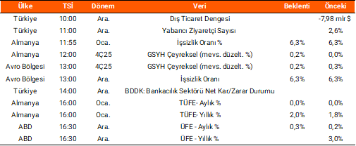 Dün yurt içinde TÜİK tarafından açıklanan verilere göre, ekonomik güven endeksi ocak ayında 99,4 seviyesinde yatay seyretti. İşsizlik oranı ise 2025 yılı Aralık ayında bir önceki aya göre 0,8 puan azalarak %7,7 seviyesine geriledi. Küresel tarafta, Avro Bölgesi’nde tüketici güven endeksi ocak ayında -12,4 seviyesinde gerçekleşerek beklentilerle uyumlu açıklandı. ABD’de haftalık işsizlik maaşı başvuruları 209 bin kişi ile piyasa beklentilerinin üzerinde gerçekleşti. Dış ticaret açığı 2025 yılı Kasım ayında aylık bazda %94,6 artarak 56,8 mlr $ seviyesine yükseldi ve beklentilerin üzerinde açıklandı. Aynı dönemde fabrika siparişleri %2,7 artış kaydederek tahminleri aştı. Bugün yurt içinde dış ticaret dengesi verisi ve aralık ayı BDDK verileri takip edilecek. Ayrıca piyasa kapanışı ardından Arçelik’in son çeyrek finansal sonuçlarını açıklaması bekleniyor. Yurt dışında ise Almanya’da 2025 yılı dördüncü çeyrek GSYH ve TÜFE verileri ile Avro Bölgesi 4Ç25 GSYH rakamları öne çıkıyor. ABD’de ise ÜFE verisi piyasaların odağında olacak.