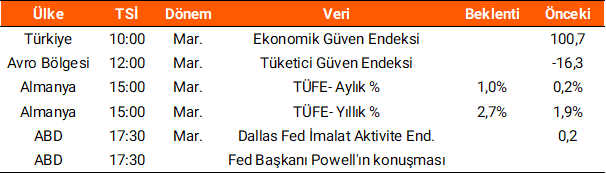 Cuma günü yurt içi ve yurt dışı veri akışı oldukça sakindi. ABD’de açıklanan Michigan tüketici beklenti endeksi mart ayında 53,3 ile beklentilerin altında gerçekleşti. Bugünün veri ajandasına baktığımızda, Avro Bölgesi’nde tüketici güven endeksi izlenirken, Almanya’da TÜFE verileri açıklanacak. Yurt içinde ise bugün ekonomik güven endeksi verisi takip edilecek.