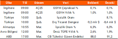 Dün yurt içinde TÜİK tarafından açıklanan verilere göre ekonomik güven endeksi mart ayında %2,8 azalışla 97,9 (önceki: 100,7) seviyesine geriledi. Yurt dışında ise Avro Bölgesi’nde tüketici güven endeksi beklentilere paralel -16,3 olarak açıklandı. Almanya’da mart ayına ilişkin TÜFE aylık %1,1 ve yıllık ise %2,7 ile beklentilere paralel gerçekleşti. Fed Başkanı Powell, dün yaptığı konuşmada, Orta Doğu’daki jeopolitik gerilimlerin yol açabileceği enerji fiyatı şoklarının ekonomi ve enflasyon üzerindeki etkilerini değerlendirmek amacıyla faiz kararlarında aceleci davranmayacaklarını ifade etti. Powell, mevcut para politikasının, gelişmeleri izlemek açısından uygun bir konumda olduğunu belirtti. Bugün içeride işsizlik oranı ve dış ticaret dengesi takip edilecek. Küresel tarafta ise İngitere’de 4Ç25 dönemine ilişkin GSYH, Avro Bölgesi’nde öncü TÜFE verisi öne çıkıyor.
