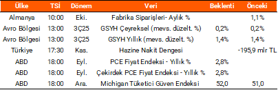 TÜİK verilerine göre mevsim etkilerinden arındırılmış aylık enflasyon kasım ayında %1,5’e (önceki: %2,07) gerilerken, mevsimsellikten arındırılmış çekirdek TÜFE ise aynı dönemde %2,11 (önceki: %1,93) seviyesinde gerçekleşti. TCMB tarafından açıklanan verilere göre TÜFE bazlı reel efektif döviz kuru kasım ayında 71,79 (önceki:71,86) seviyesine geriledi. Yurt İçi Üretici Fiyat Endeksi (Yİ-ÜFE) bazlı reel efektif döviz kuru endeksi ise 95,52’den 95,47’ye sınırlı bir düşüş gösterdi. Küresel tarafta, Avro Bölgesi’nde perakende satışlar ekimde aylık bazda tahminlere paralel olarak değişim göstermezken, yıllık bazda ise %1,5 seviyesinde gerçekleşti. ABD’de, haftalık işsizlik maaşı başvuruları 191 bin ile beklentilerin altında kaldı. Bugün yurt içinde kasım ayı hazine nakit dengesi açıklanacak. Küresel veri gündeminde ise Almanya fabrika siparişleri, Avro Bölgesi 3Ç25 GSYH büyümesi ve ABD Kişisel Tüketim Harcamaları (PCE) fiyat endeksi takip edilecek.